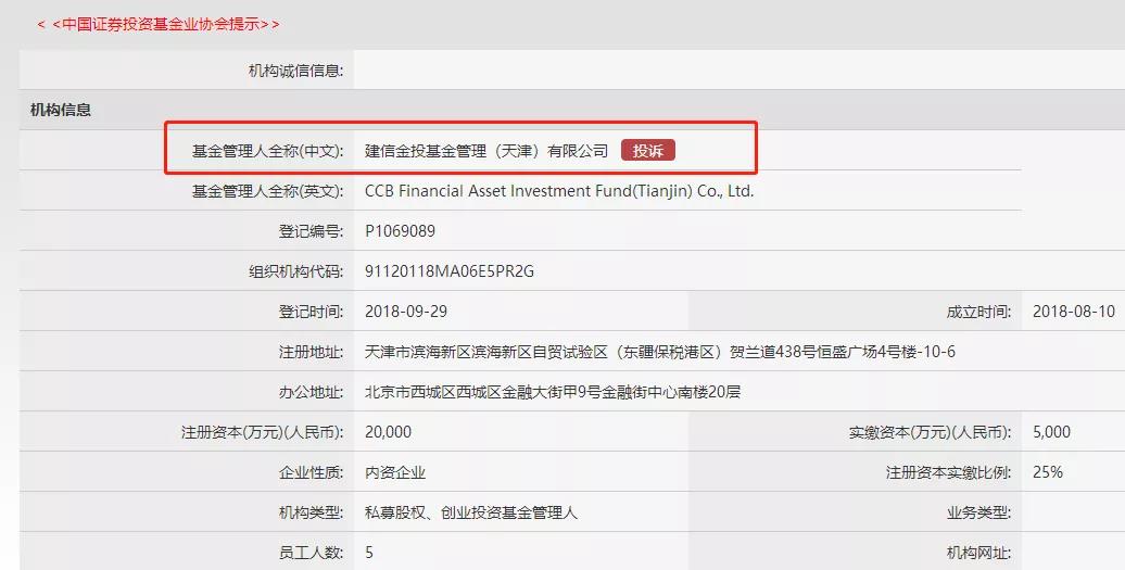 協(xié)會(huì)備案信息顯示,建信金投基金管理(天津)有限公司(簡(jiǎn)稱“建信金投基金”)成立于2018年8月10日,隨后于9月29日就在中國(guó)證券投資基金業(yè)協(xié)會(huì)完成私募基金管理人登記。