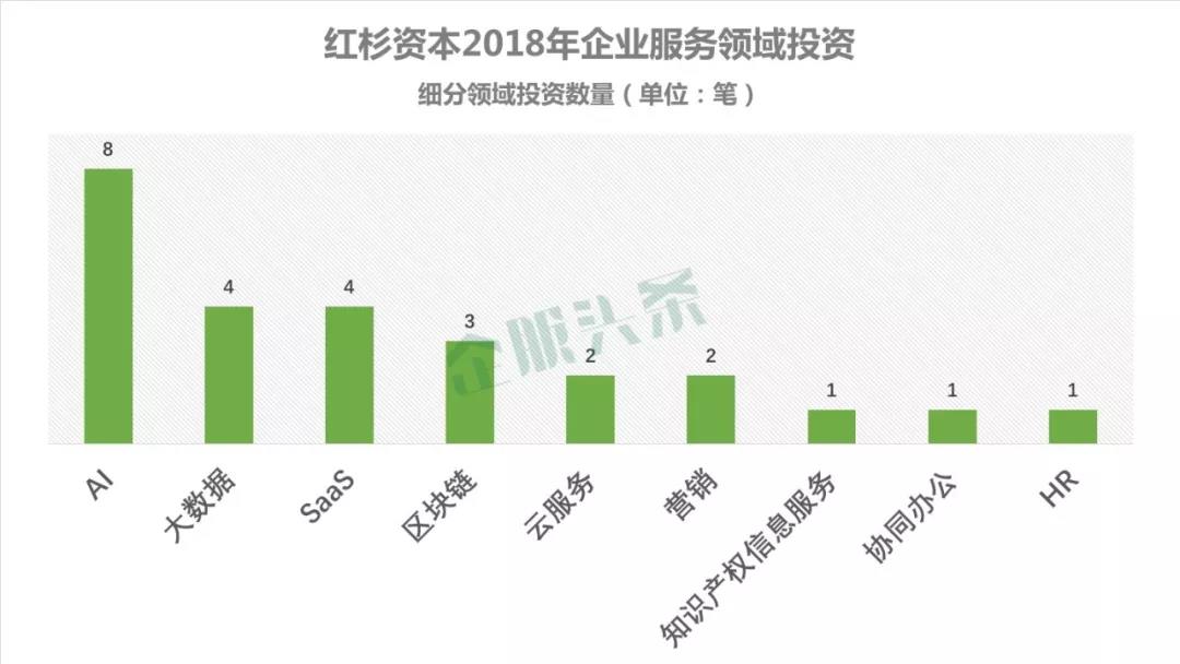 比如紅杉雖然在企業(yè)服務(wù)領(lǐng)域的投資數(shù)量較多,但是因?yàn)榻衲甏蟀胭Y金都涌入了金融行業(yè),所以在其他行業(yè)的投資金額相對(duì)較少。